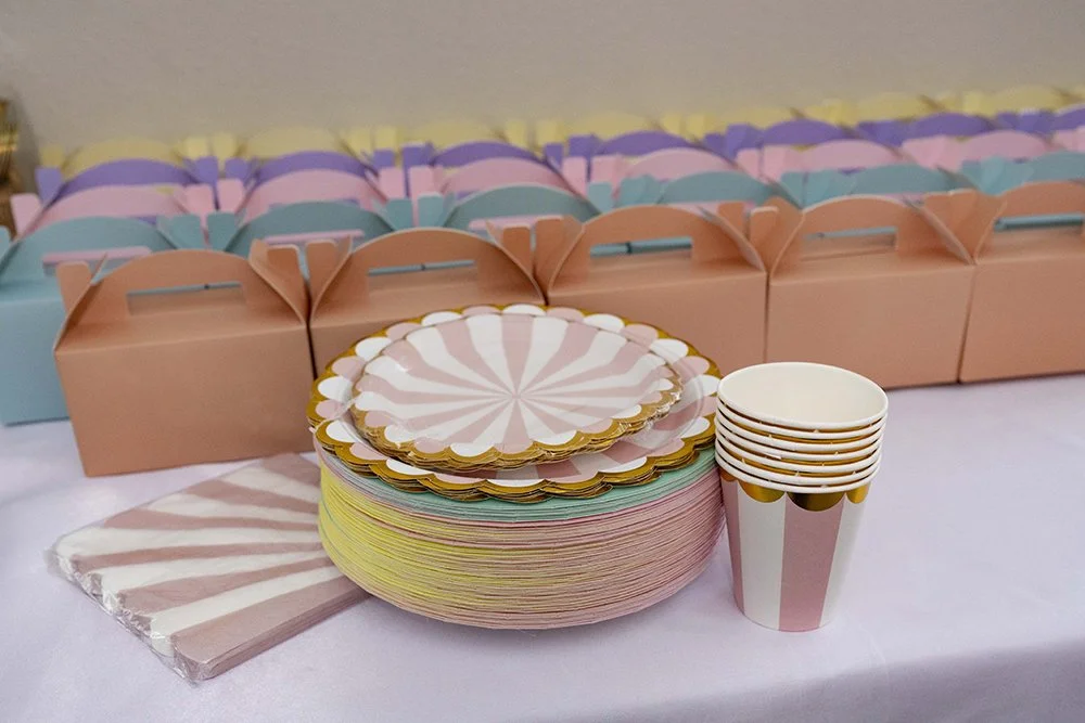 Plates, Cups, and Party Favors: I used pastel-themed plates and cups, along with gift boxes filled with mini gumball machines, slinkys, and bubbles as party favors. The kids couldn’t get enough of the surprises inside!