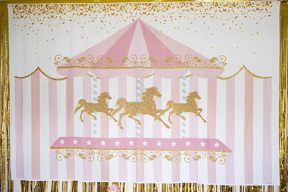 Backdrop: The horse carousel backdrop from Amazon was the focal point of the setup, and I added a gold fringe curtains behind and around it to make it really pop.